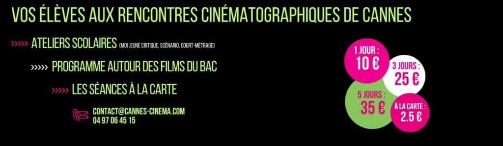Il est possible de s’inscrire à des séances organisées par Cannes Cinéma dans le cadre de sa saison cinématographique ou dans le cadre de ses évènements. 2,5€/Séance/élève